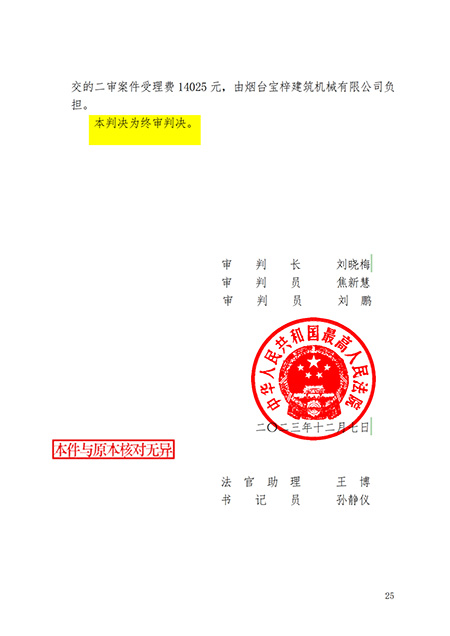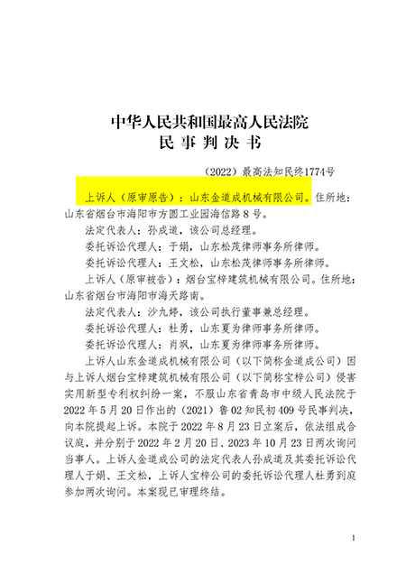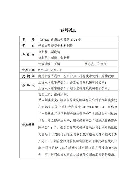 山東金道成機(jī)械有限公司于2021年11月26日立案起訴煙臺(tái)寶梓建筑機(jī)械有限公司侵犯“鍋爐爐膛檢修升降平臺(tái)”的專(zhuān)利權(quán)一案,經(jīng)過(guò)一審、二審法院2年零11天的審查,于2023年12月07日,中華人民共和國(guó)最高人民法院做出(2022)最高法知民終1774號(hào)的終審判決: