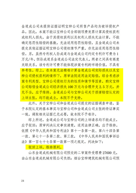關(guān)于煙臺(tái)寶梓建筑機(jī)械有限公司侵犯山東金道成機(jī)械有限公司專(zhuān)利權(quán)的判決